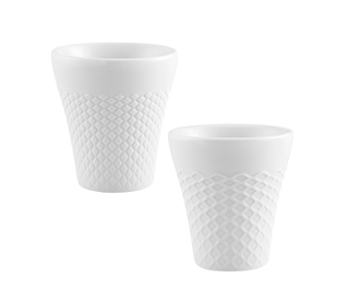 Juego 2 Tazas Café s/Ala Fiction. Las tazas Fiction tienen como imaginario creativo los patrones que revisten los edificios de las ciudades futuristas en las películas de ciencia ficción.